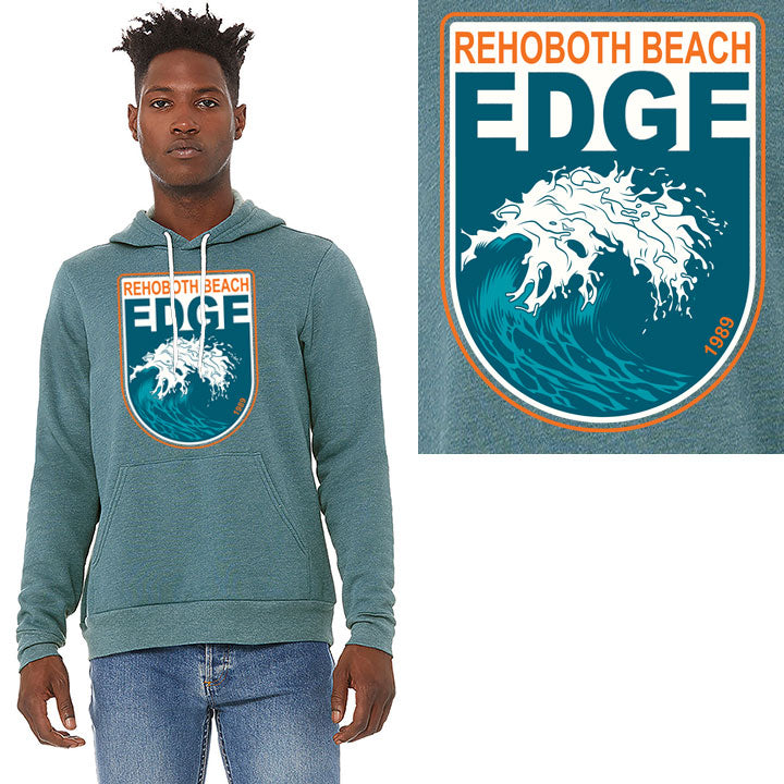 50% cotton 50% polyester hooded sweatshirt with marspuial pocket and front Big Wave Design printed on front. Plain back. Available in Small, Medium, Large, XLarge, 3XL.