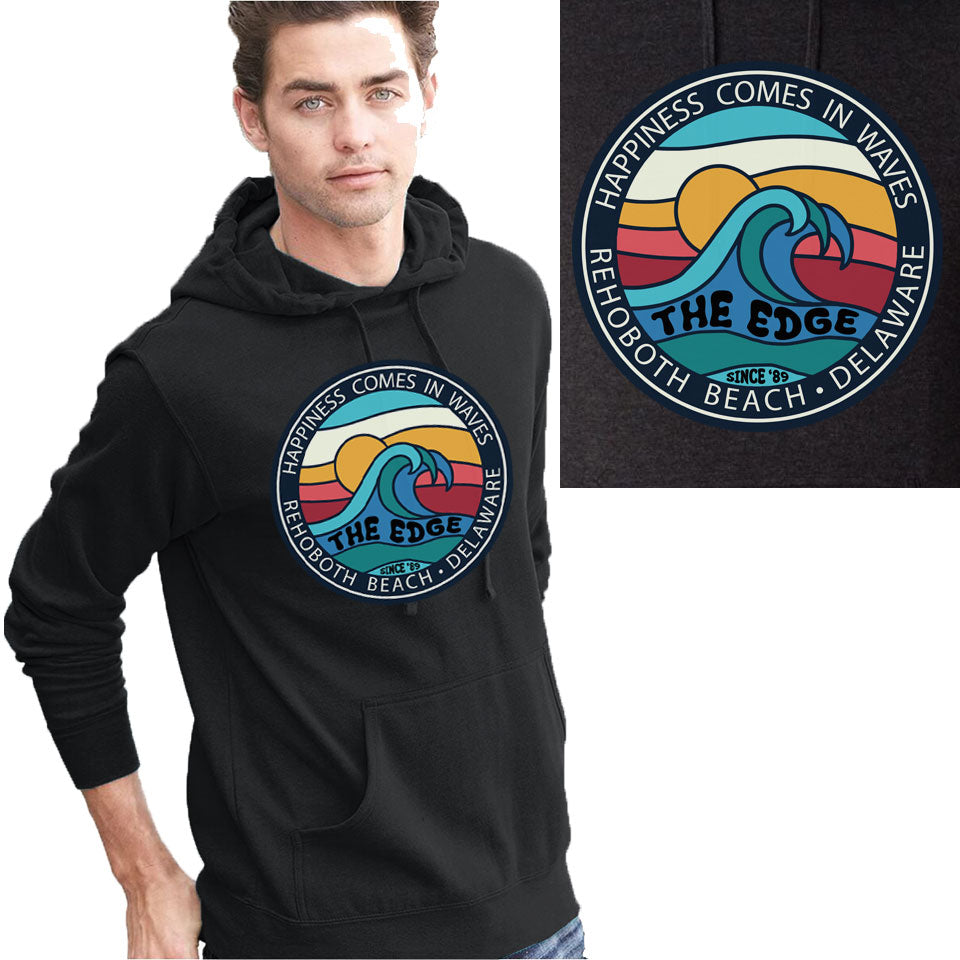50% cotton 50% polyester hooded sweatshirt with marspuial pocket and front Edge Surf Delaware screenprint. Plain back. Available in small, Medium, X-Large. FREE SHIPPING!