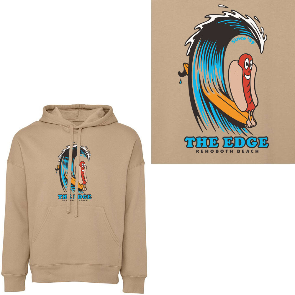 52% cotton 48% polyester hooded sweatshirt with front pocket. Pre-shrunk. Front Hot Dog hanging ten print for Edge of Rehoboth Beach. Available in X-Small, Small, Medium, Large, XLarge, 2XL, 3XL.