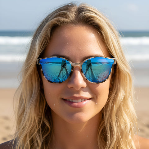 Peppers Coral Polarized Floating Sunglasses in matte trans grey tort and blue revo polarized