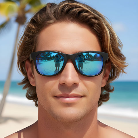 Suncloud Leeway Polarized Sunglasses in matte black and polar blue mirror