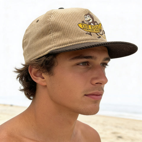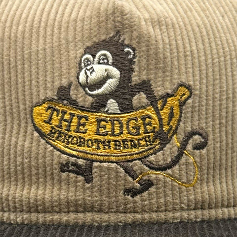 Edge Big Banana embroidered logo on front. Originally called Surf Monkey. Wide whale corduroy material. 5-panel construction. Flat brim. Black sweatband. Adjustable corduroy back strap with metal slide and tuckaway slot. Embroidered eyelets. Available in One Size.