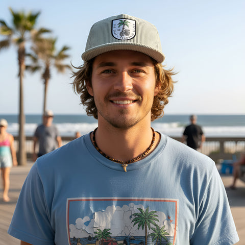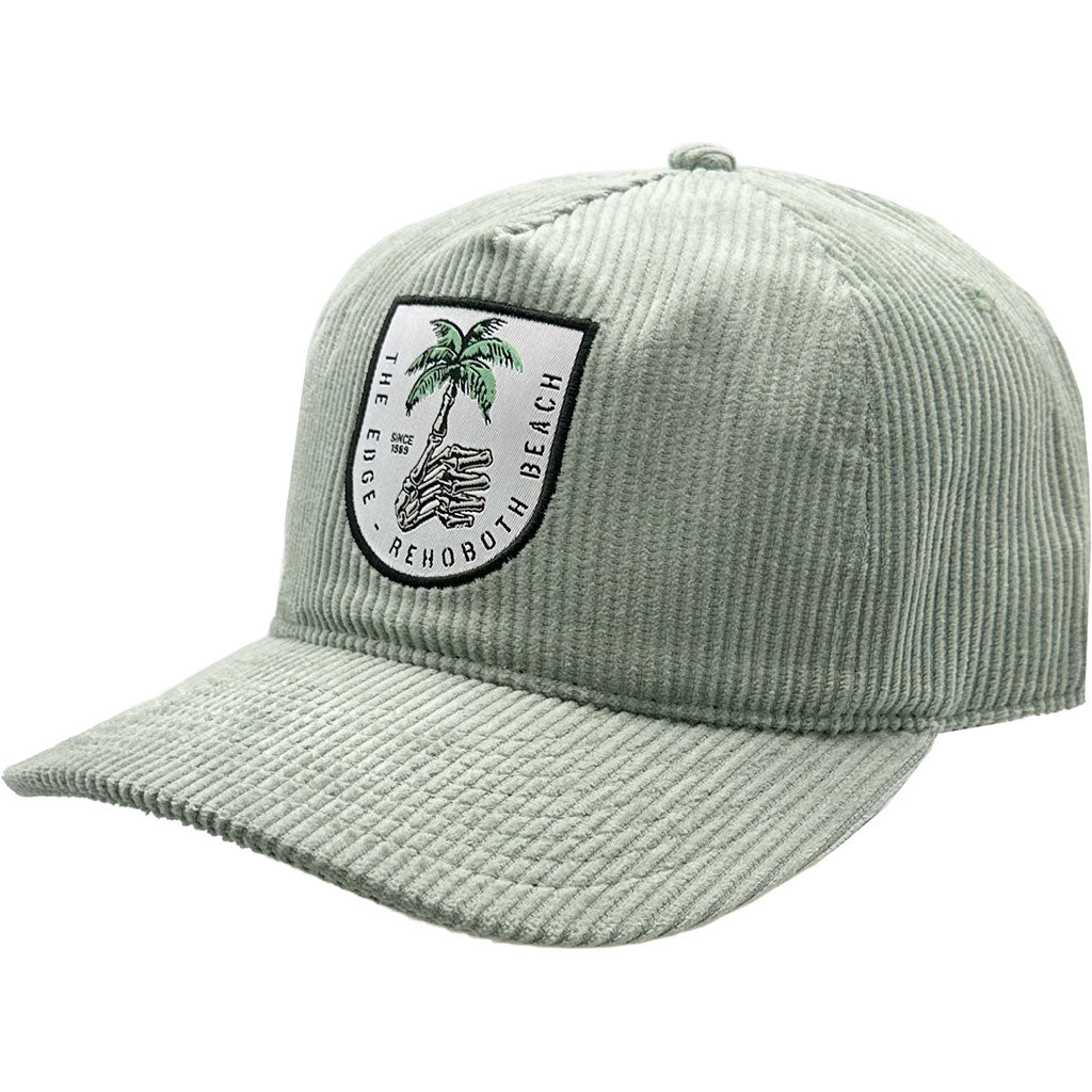 Edge Boney Palm Tree Patch on front. Wide whale corduroy material. 5-panel A-Frame construction. Flat brim. Black sweatband. Adjustable plastic snapback closure. Embroidered eyelets. Available in One Size, .