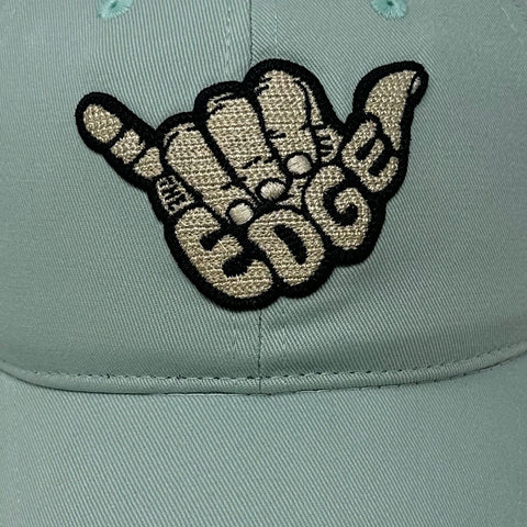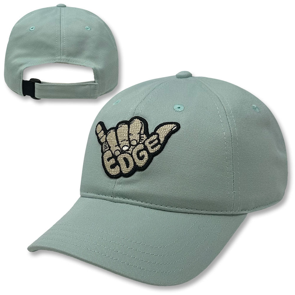 Modernized 6-panel curved brim strapback. Front raised embroidered Hang Loose with embedded 'THE EDGE' in the palm. Embroidered eyelets. Matching top button. Taped seams. black sweatband. Adjustable velcro closure with flex band. Available in One Size, .