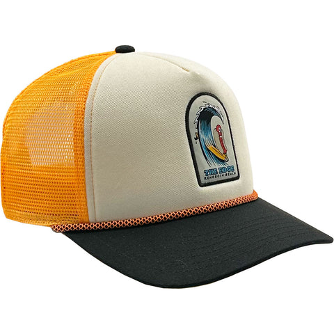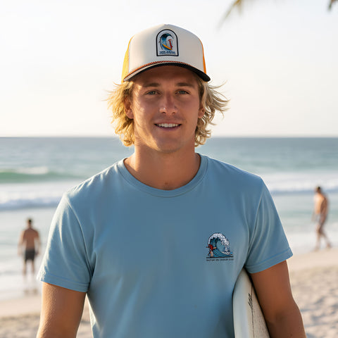 Ride the wave in style with this fun and quirky 5-panel A-frame trucker hat featuring an embroidered hot dog surfing and hanging ten on the front. Designed for comfort and attitude, it sports breathable mesh back panels and an adjustable snapback closure for the perfect fit. Whether you’re beach-bound or just craving summer vibes, this hat brings the perfect mix of humor, beach, and hang loose energy! Available in One Size.