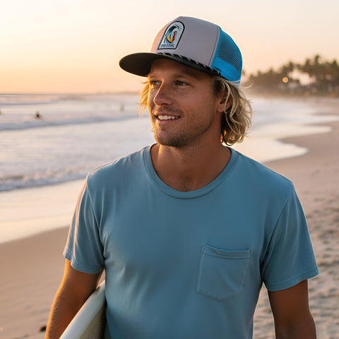 Ride the wave in style with this fun and quirky 5-panel A-frame trucker hat featuring an embroidered hot dog surfing and hanging ten on the front. Designed for comfort and attitude, it sports breathable mesh back panels and an adjustable snapback closure for the perfect fit. Whether you’re beach-bound or just craving summer vibes, this hat brings the perfect mix of humor, beach, and hang loose energy! Available in One Size.