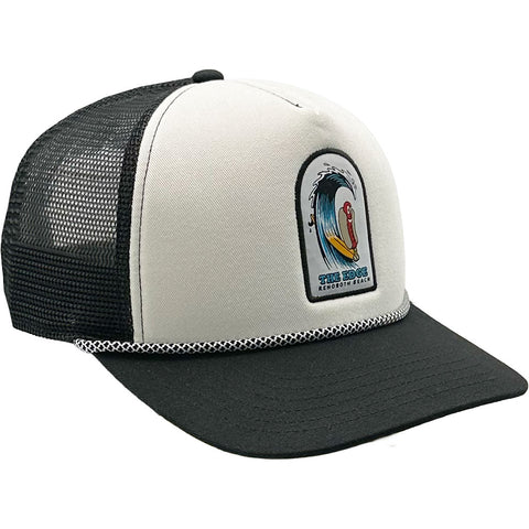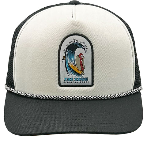 Ride the wave in style with this fun and quirky 5-panel A-frame trucker hat featuring an embroidered hot dog surfing and hanging ten on the front. Designed for comfort and attitude, it sports breathable mesh back panels and an adjustable snapback closure for the perfect fit. Whether you’re beach-bound or just craving summer vibes, this hat brings the perfect mix of humor, beach, and hang loose energy! Available in One Size.