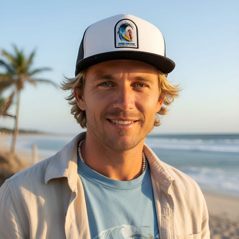 Ride the wave in style with this fun and quirky 5-panel A-frame trucker hat featuring an embroidered hot dog surfing and hanging ten on the front. Designed for comfort and attitude, it sports breathable mesh back panels and an adjustable snapback closure for the perfect fit. Whether you’re beach-bound or just craving summer vibes, this hat brings the perfect mix of humor, beach, and hang loose energy. Available in One Size, .