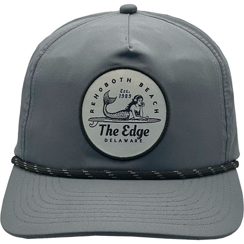 Turn heads with this A-Frame all-weather snapback that blends timeless rope styling with a unique front patch featuring a modern mermaid luonging on a surfboard, headphones on and lost in her playlist. An ocean inspired design for those who carry the beach with them year-round. Available in One Size, .
