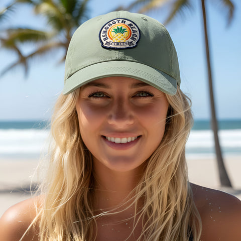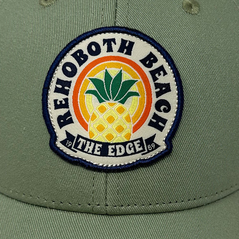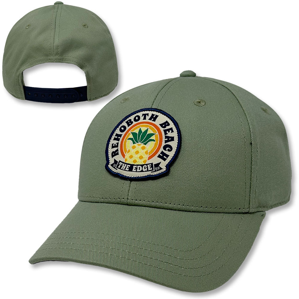 The popular 6-panel curved brim snapback. Front Sunset Pineapple patch. Embroidered eyelets. Matching top button. Taped seams. black sweatband. Adjustable snapback closure. Available in One Size, .