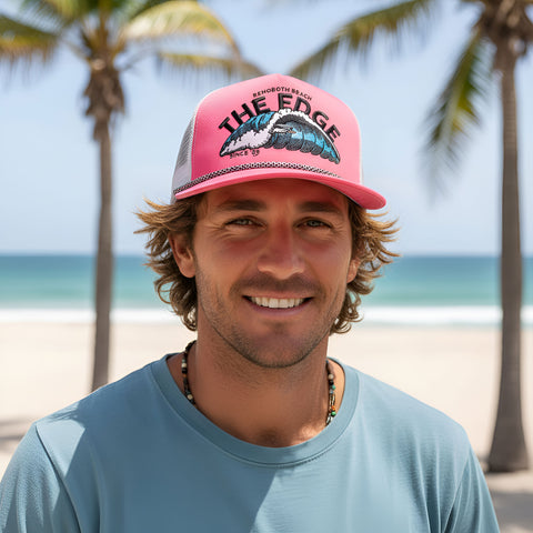 Get fully tubed in this 80's inspired surf logo! A-Frame construction. Mesh back trucker hat with snapback closure. Edge Tubular embroidery on front. Slight curved brim. Poly rope accent. Taped seams. Available in One Size, .