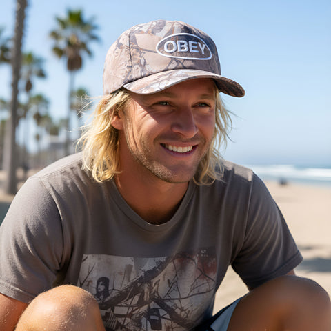 Obey Oval 5 Panel Strapback Hats in fence camo