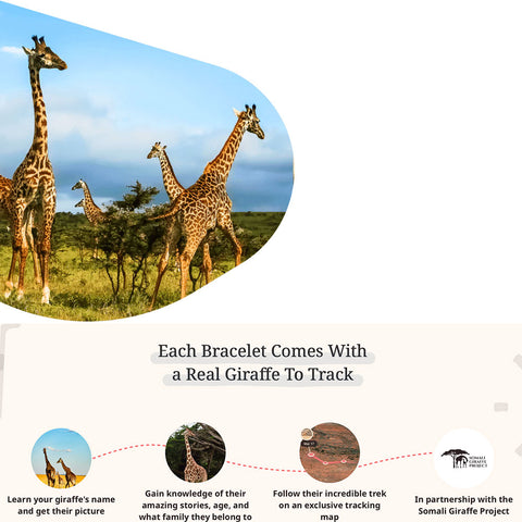 Learn your giraffe's name and get their picture. Gain knowledge of their amazing stories, age, and what family they belong to. Follow their incredible trek on an exclusive tracking map. In partnership with the Somali Giraffe Project. The Trek Bracelet - Each bracelet tracks a giraffe! Available in One Size, .