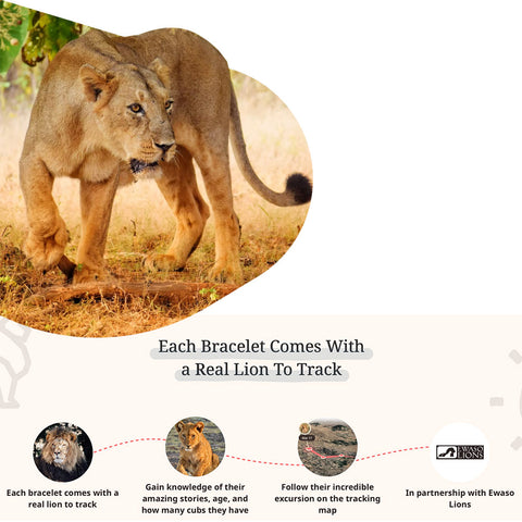 Each bracelet comes with a real lion to track. Gain knowledge of their amazing stories, age, and how many cubs they have. Follow their incredible excursion on the tracking map. In partnership with Ewaso Lions. The Excursion Bracelet - Each bracelet tracks a lion! Available in One Size, .