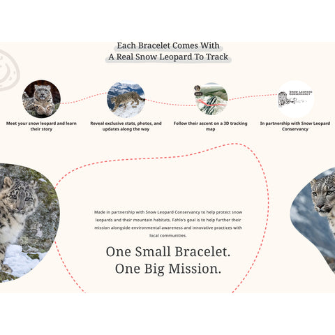 Learn your snow leopard's name and get their picture. Gain knowledge of their amazing stories and best of all... Follow their incredible odyssey on an exclusive tracking map. In partnership with the Snow Leopard Conservancy. The Ascent Bracelet - Each bracelet tracks a snow leopard! Available in One Size.