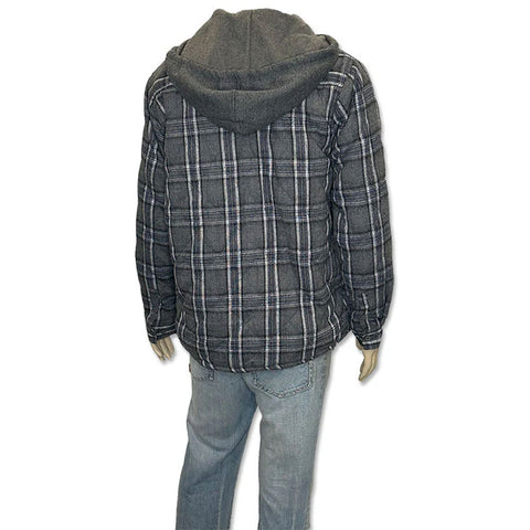 55% cotton 45% polyester. Body lining 100% polyester. Black sherpa lined grey plaid hooded flannel. Accented with four pockets. Two pockets on the chest and one pocket on each side seam. Available in Large, small, X-Large, . FREE SHIPPING!