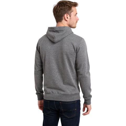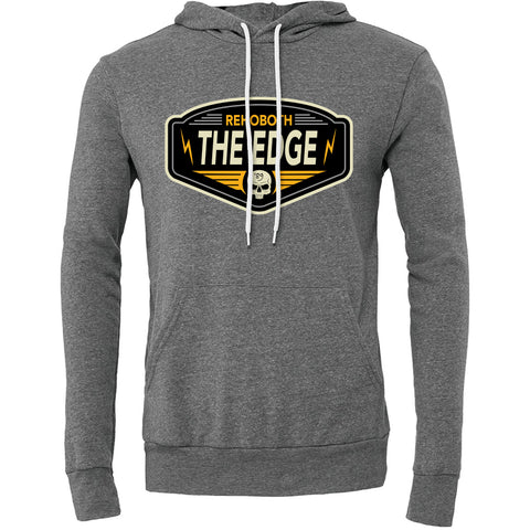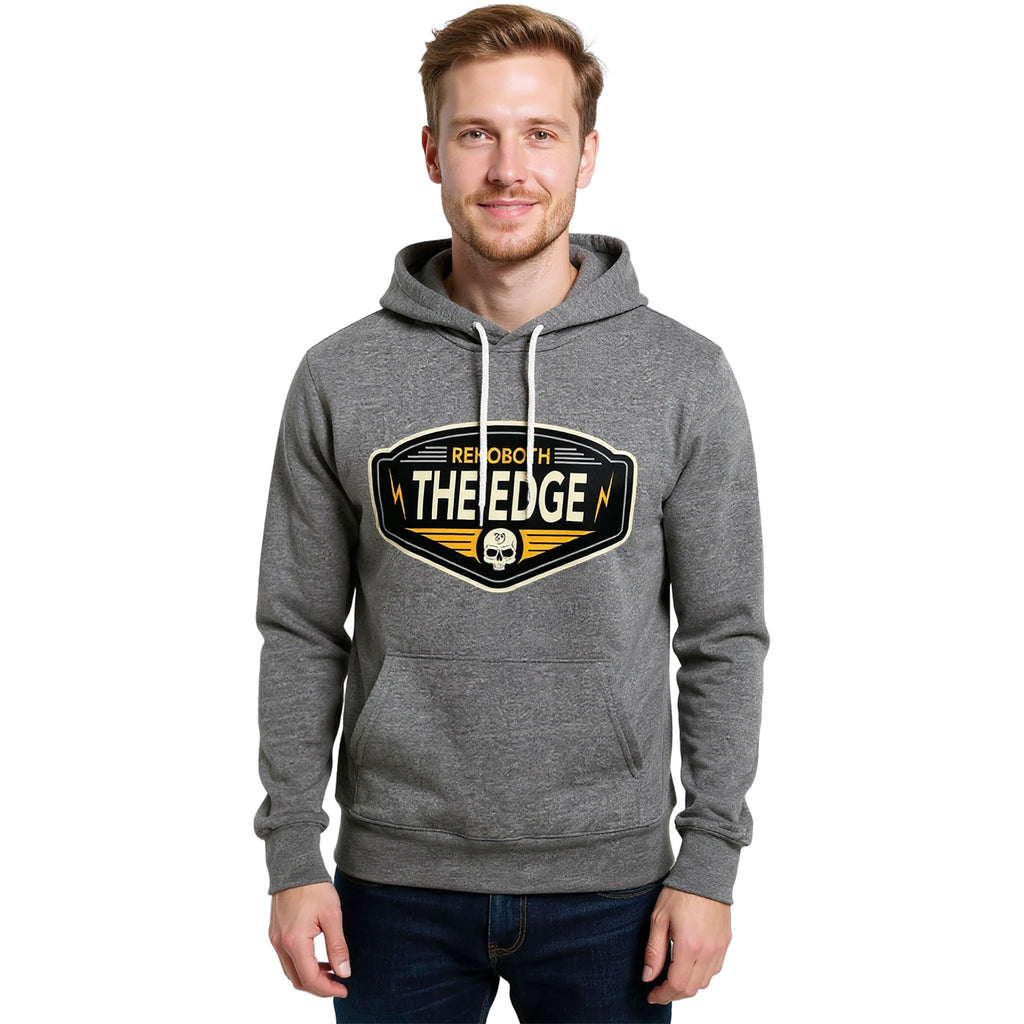 52% cotton 48% polyester hooded sweatshirt with kangaroo pocket and front Edge Monkey Biz screenprint. Plain back. Available in 2XL.