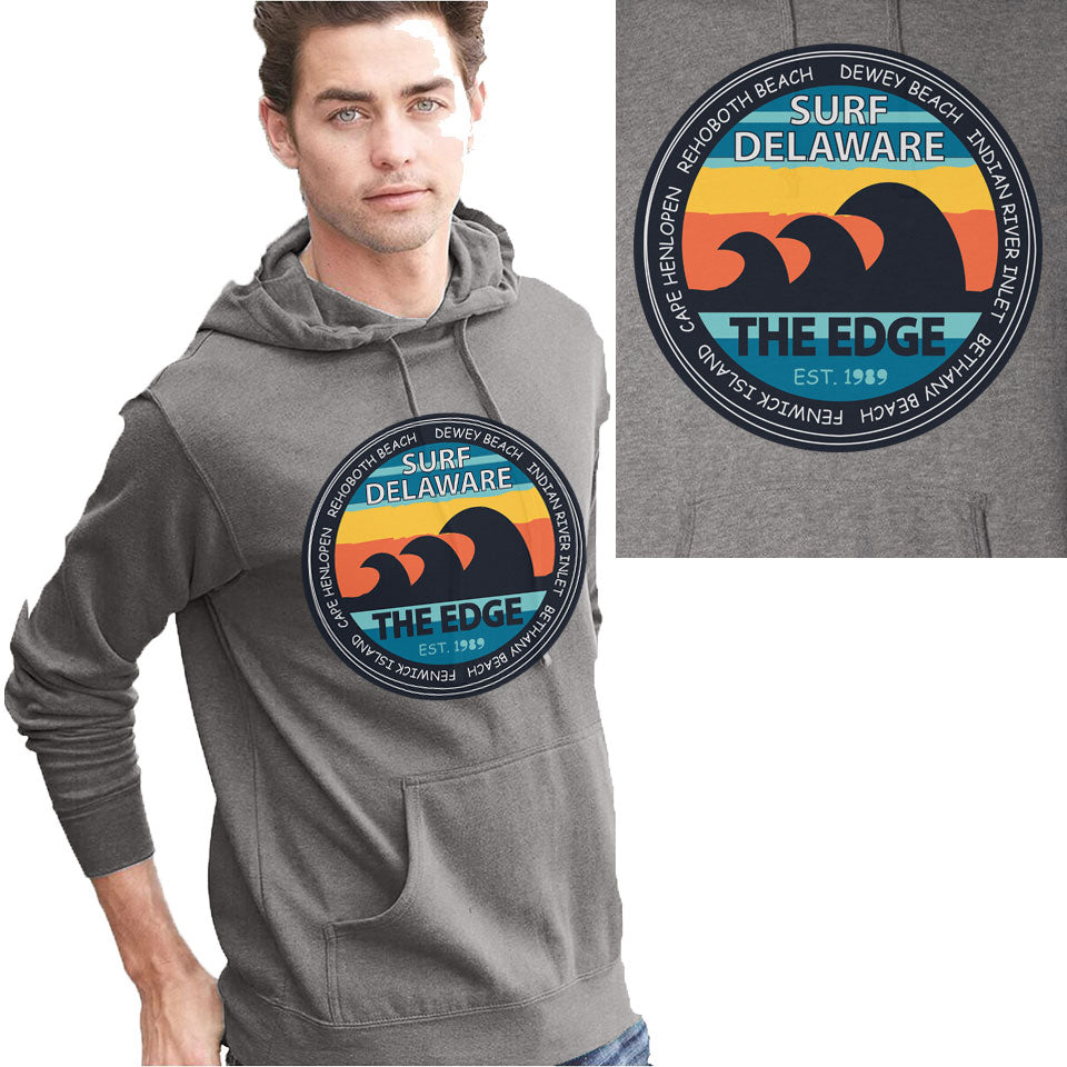 50% cotton 50% polyester hooded sweatshirt with marspuial pocket and front Edge Surf Delaware screenprint. Plain back. Available in XSmall, Small, Medium, XLarge, 2XL, 3XL.