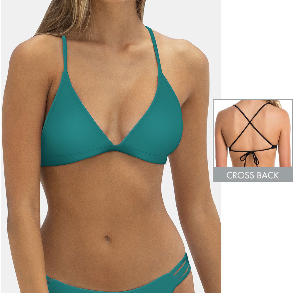 90% Polyester 10% Spandex. Regular Coverage, classic beachy fit. Cross back strap tie bikini top with super soft, quick dry material. Available in XLarge.
