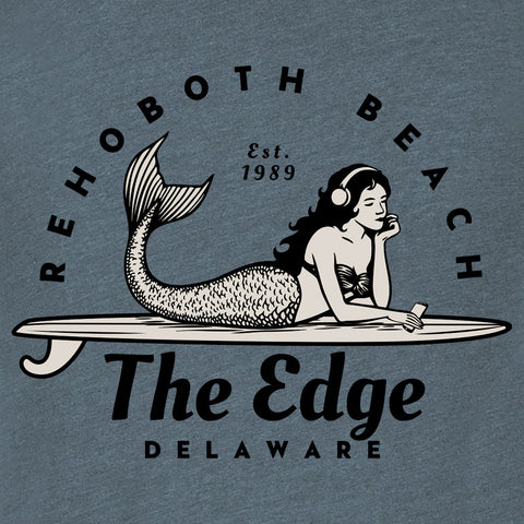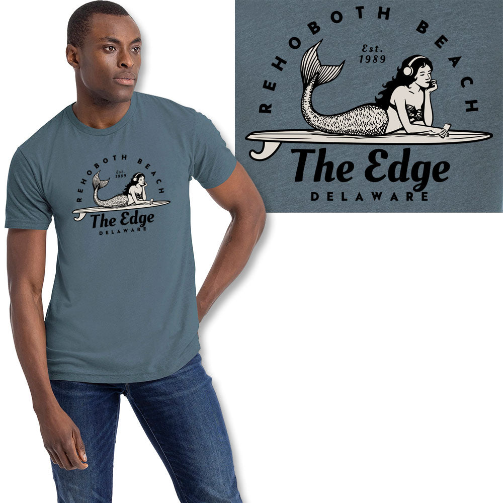 60% cotton 40% polyester premium short sleeve tee. Mermaid on a surfboard - what could be better than lounging around listening to some tunes? Sun and surf is embodied in this relaxed and clean design. Large front print. Plain back. Available in XSmall, Large, XLarge, 3XL, .