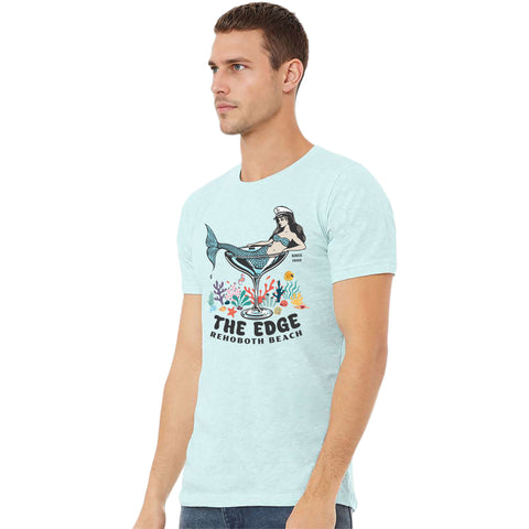 52% cotton 48% polyester slim fit mens short sleeve crew neck t-shirt. Pre-washed and Pre-shrunk. Mermaid wearing a captians hat in a large Martini glass at the bottom of the ocean front print. Drink up! Available in Small, Large, XLarge, 2XL, .