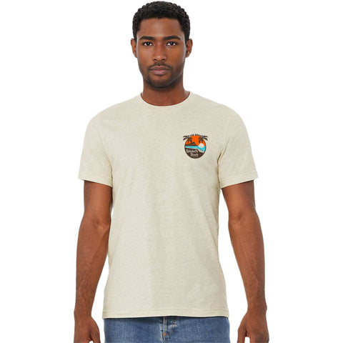 52% cotton 48% polyester slim fit mens short sleeve crew neck t-shirt. Pre-washed and Pre-shrunk. Classic beach scene on front left chest and large back print. The beach life never gets old! Available in Medium, XLarge, .