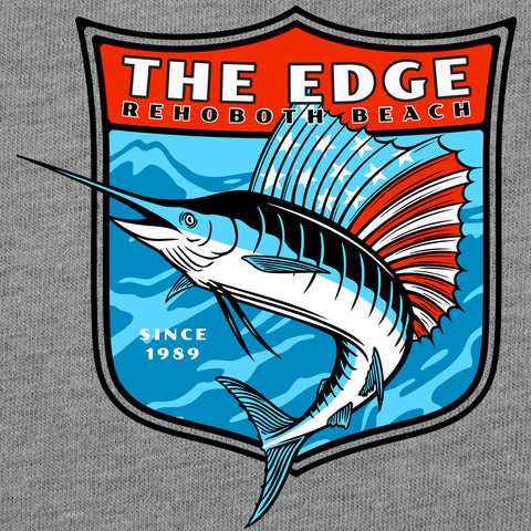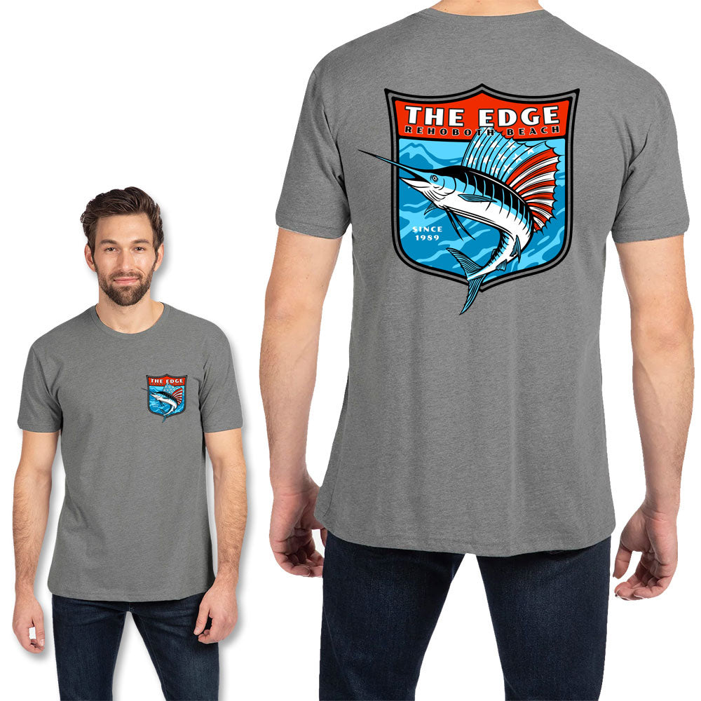 Red, White, and Blue Marlin with stars and stripes sail in a shield border. Front left-chest logo with same large back print. 60% cotton, 40% polyester CVC Tee. Tear-away labels. Available in Small, XLarge, .