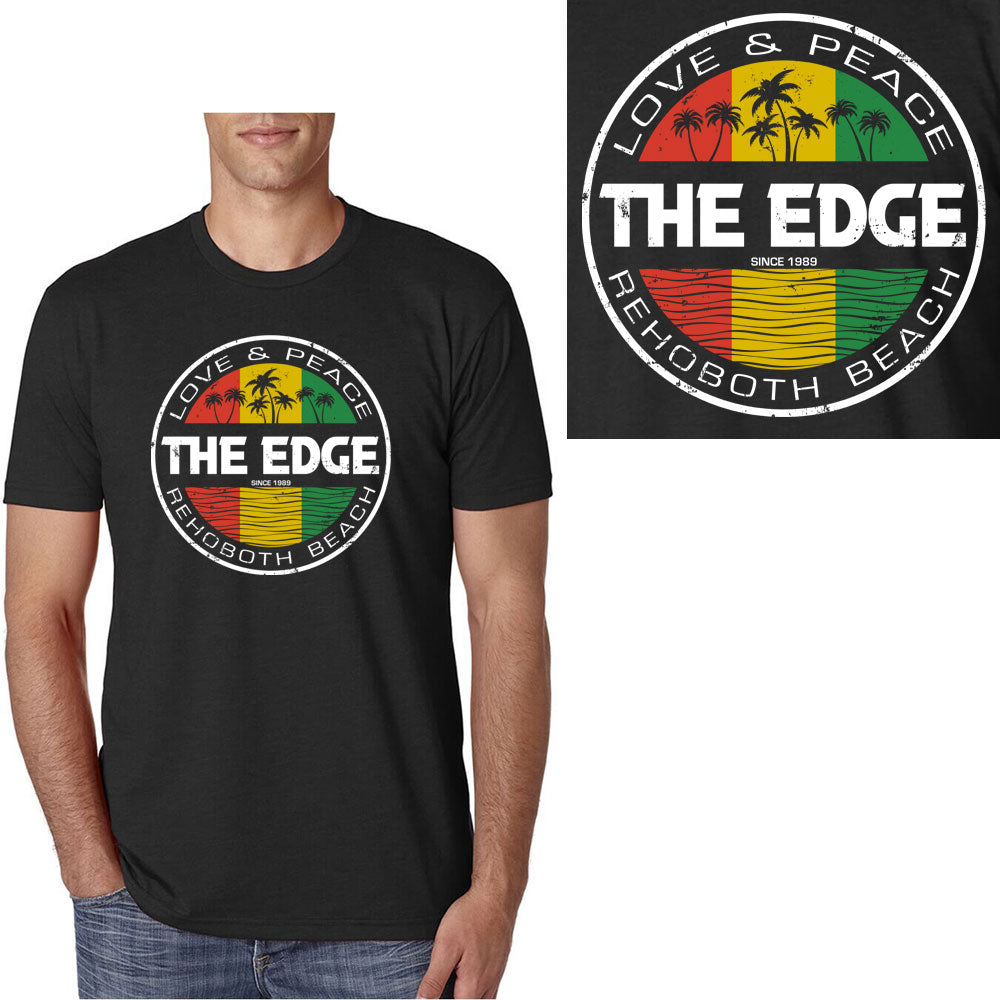 The Rasta Vibe never ends. Center chest Love and Peace design in rasta colors with water and palms. 60% combed cotton/40% polyester jersey. 4.3-oz weight. 32 singles for extreme softness. Tear-Away Label. Available in Small, XLarge, 3XL.