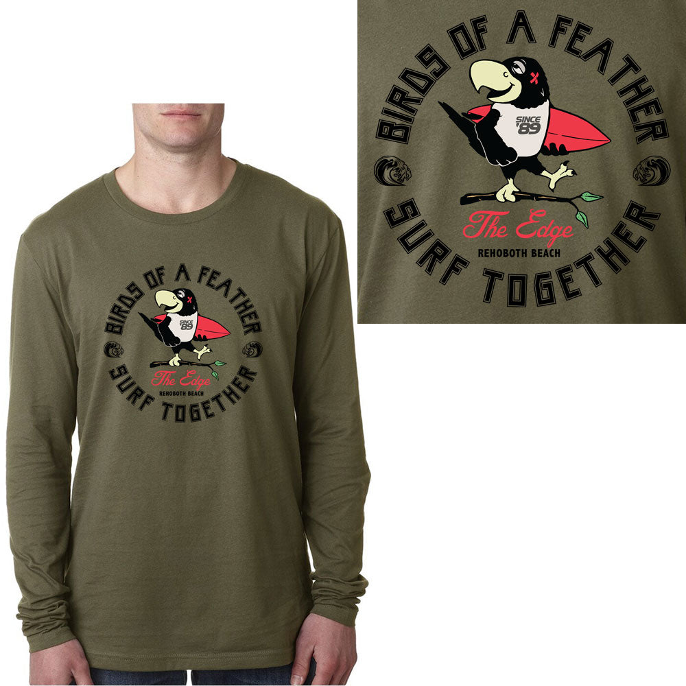 Birds of a Feather Surf Together design for Edge of Rehoboth Beach. Next Level Long Sleeve Premium Tee 100% cotton with tear-away tags.Prewashed and Preshrunk. Available in Small, Large, XLarge.