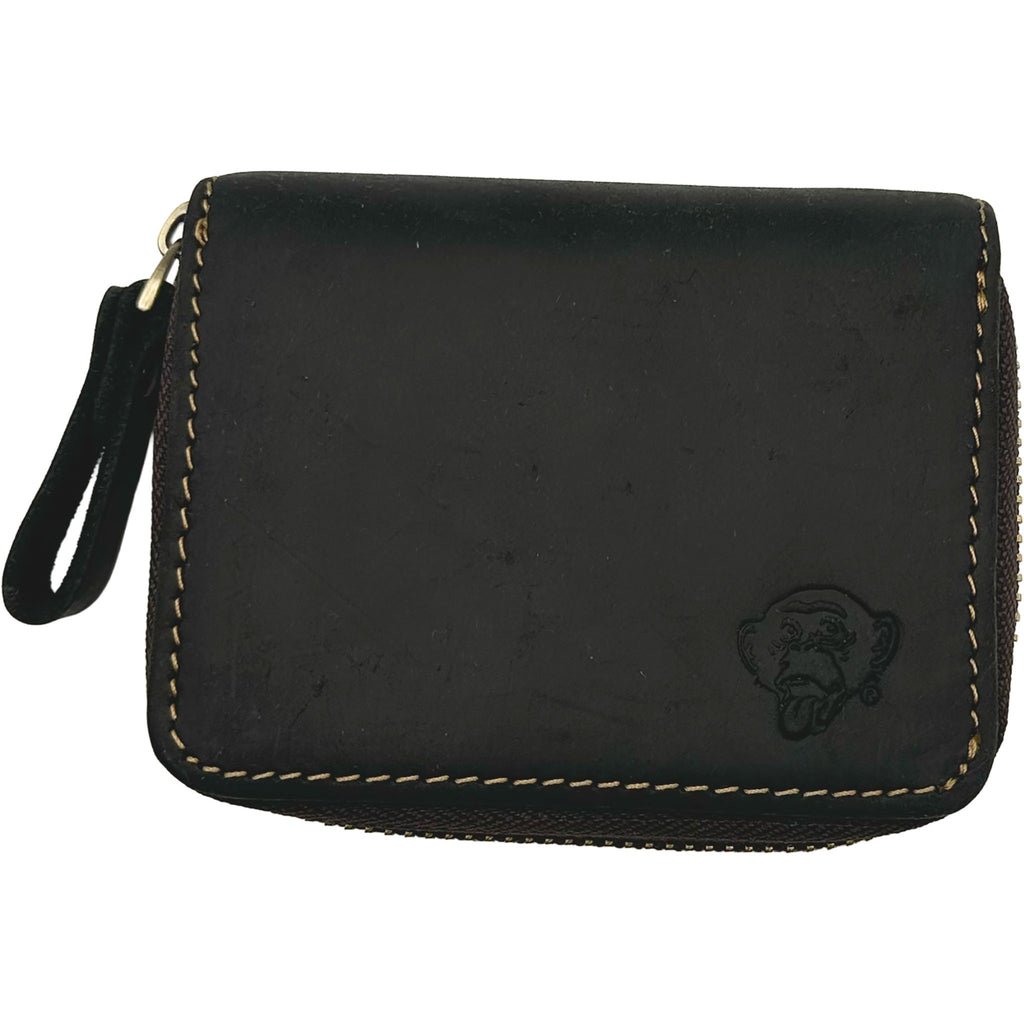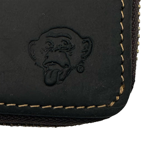 Genuine Leather zippered wallet. 9 card slots in total. Plus 2 outer compartments. Metal zipper closure with leather pull tab. Embossed Edge Monkey Business logo. Available in one size.